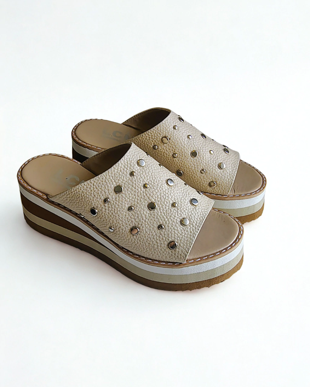 Base de goma EVA, liviana y resistente, con altura de 6 cm atrás y 4 cm adelante, que aporta comodidad sin perder equilibrio. Disponible en negro y natural.